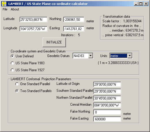 US State Plane co-ordinates transformation calculator. Lambert conformal projection.