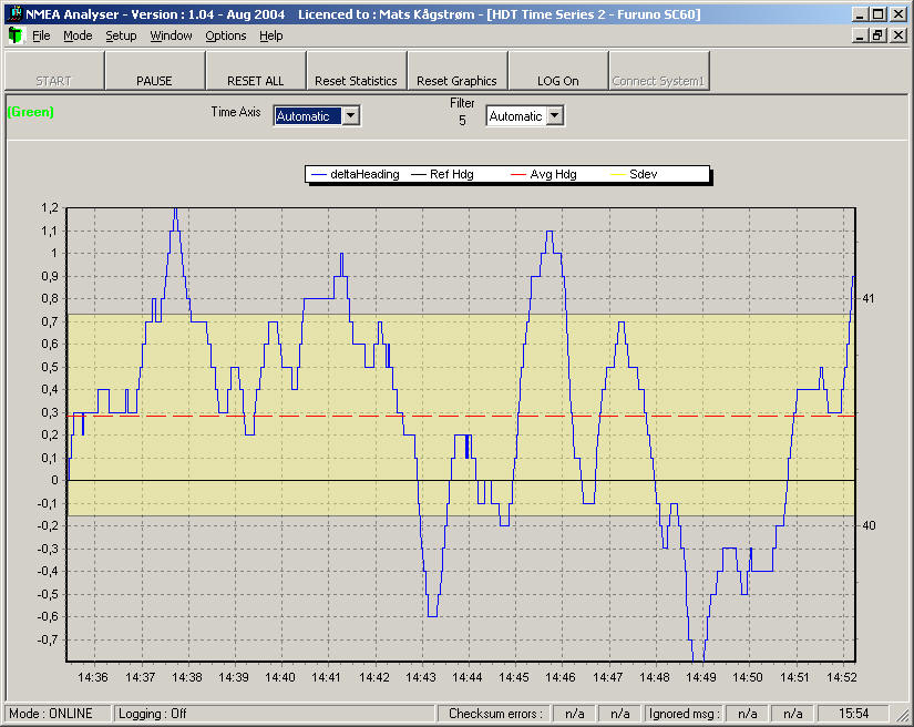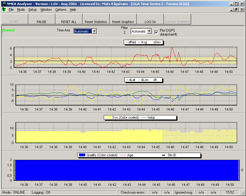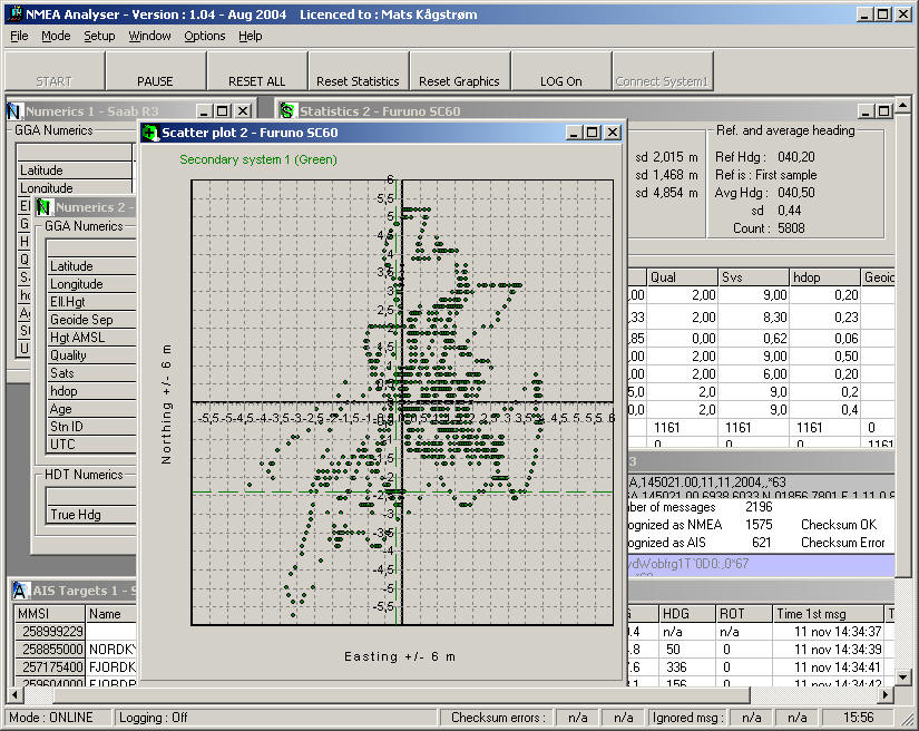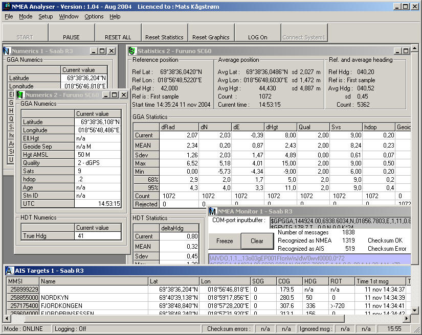 Screendump example : 1) Analysing Saab R3 (GGA) 2) Analysing Furuno SC60, GPS gyro (GGA & HDT)