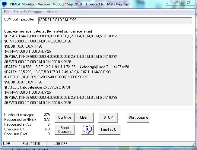 NMEA Monitor is designed to monitor NMEA or AIS data received on serial device, UDP or TCP/IP. A special version of the program, NMEA Filemonitor, monitors data from file. NMEA_Filemonitor can also transmit the NMEA messages on a serial port, UDP or TCP/IP..